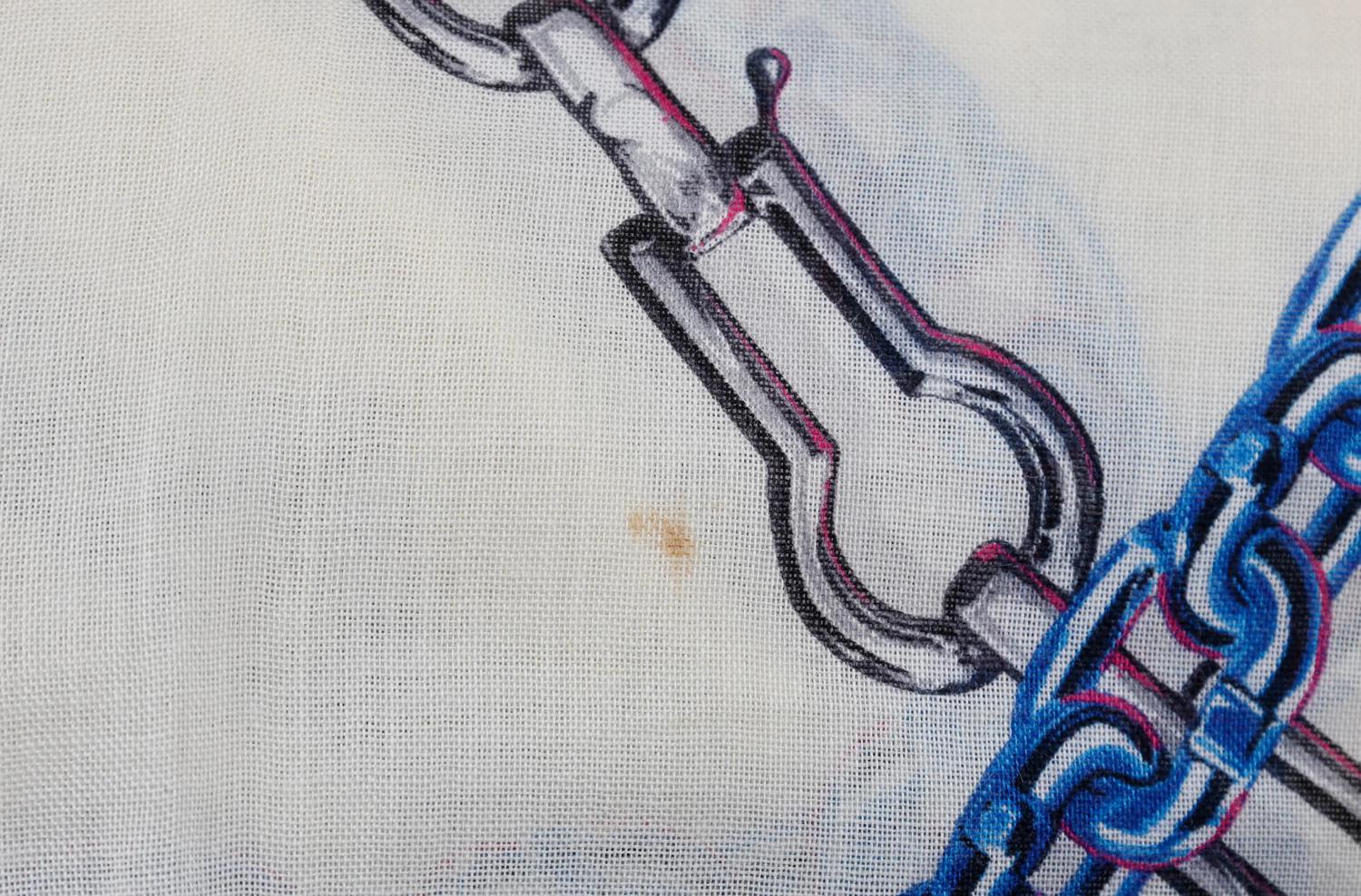 This Louis Vuitton scarf features a unique chain print on a white background, with a multicolor pattern inspired by the 2016 cruise collection. Crafted out of a luxurious blend of silk and cashmere, it features a fringe detail on the edges. Cm 174x136. Inclusion: Box. Remarks: There are two small spots. Well preserved.